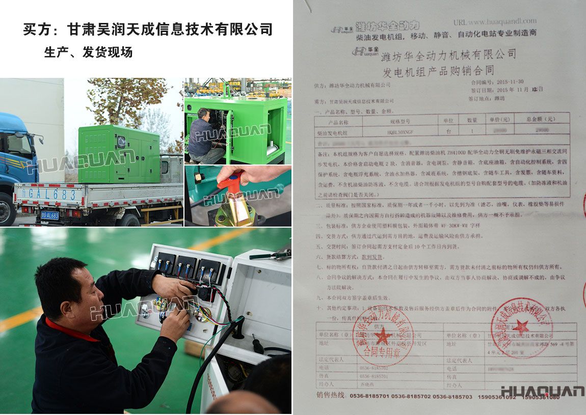 作為信息技術(shù)公司離不開(kāi)電力的支持。為了避免因缺電、停電而造成的經(jīng)濟(jì)損失。甘肅吳潤(rùn)天成信息技術(shù)有限公司在2014年8月30日、2015年11月12日分別在華全動(dòng)力采購(gòu)一臺(tái)柴油發(fā)電機(jī)組。