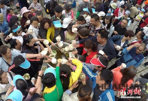 根據(jù)現(xiàn)場描述:5月22日當天,道教圣地——欒川老君山的中天門廣場,一塊直徑約5米的“天下 太極豆腐”居中擺放。據(jù)了解,該豆腐是由老君山香客捐贈的谷物制作而成,讓民眾免費品嘗。豆腐為圓形,重量4200斤,用去黃豆2000余斤,上面呈現(xiàn)太極圖并寫著“天下 太極豆腐”。當?shù)孛袼讚尪垢礊?ldquo;搶頭福”,開吃兩個多小時即被游客搶光?,F(xiàn)場還配有豆花和調(diào)料汁,讓游客感受欒川豆腐的 魅力。