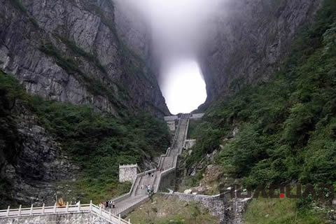 天門(mén)山(古稱云夢(mèng)山),又名玉屏山,坐落于張家界市區(qū)以南10公里。公元263年,因山壁崩塌而使山體上部洞開(kāi)一門(mén),南北相通,吳帝孫休以為吉祥,便賜名天門(mén)山。天門(mén)主峰海拔1518.6米,屬典型的喀斯特地貌。天門(mén)洞則高131.5米,寬57米,深60米,南北對(duì)開(kāi),終年云蒸霞蔚,歷有天門(mén)吐霧、天門(mén)靈光、梅花飄雨等三大奇景。如今的天門(mén)山,已建設(shè)為 森林公園,為 AAAAA旅游景區(qū),景區(qū)以觀光游覽為主線,深掘文化內(nèi)涵,完整的體現(xiàn)了其“神奇”“神秘”“神圣”的大氛圍和主格調(diào),分為天門(mén)洞開(kāi)、天界佛國(guó)、丹灶飛煙等十大景觀和天門(mén)山索道、通天大道、天門(mén)洞、上天梯、云夢(mèng)仙頂?shù)?0余處人文與自然景點(diǎn)。的天門(mén)山索道,斜長(zhǎng)7455米,上、下站水平高差1279米,成為世界上 長(zhǎng)的單線循環(huán)脫掛抱索器車廂式索道。