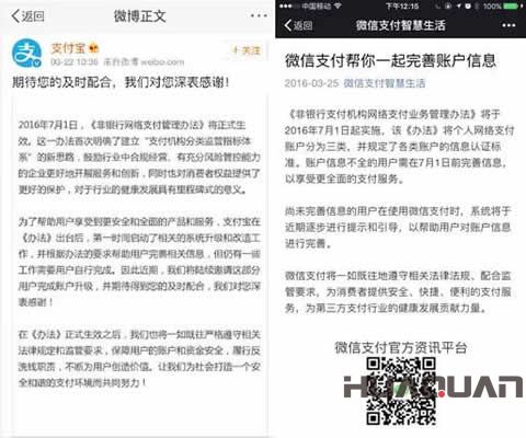受到央行新規(guī)的約束,支付寶、微信支付等網(wǎng)絡(luò)支付平臺(tái)為了保證用戶在7月1日后依然能順利使用現(xiàn)有支付服務(wù),因此紛紛開(kāi)始行動(dòng)。